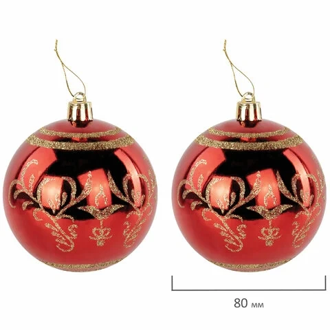 2 шара красного цвета с золотыми узорами с глянцевым эффектом (диаметром 8 см),