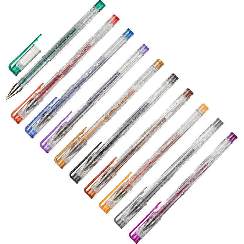 Набор гелевых ручек PVC в мягкой упаковке, 10 цветов, чернила с блестками. Корпуса пластиковые. Ручки обеспечивают легкое и мягкое письмо, яркие и насыщенные линии толщиной 0,7 мм. Чернила быстро высыхают, не размазываются. Расходные материалы для данной ручки не представлены в ассортименте производителя и в ассортименте компании Комус.