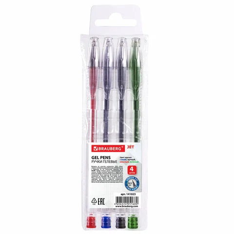 Набор гелевых ручек Brauberg Jet 4 цвета, 0.35мм, 4шт/уп, прозрачный корпус