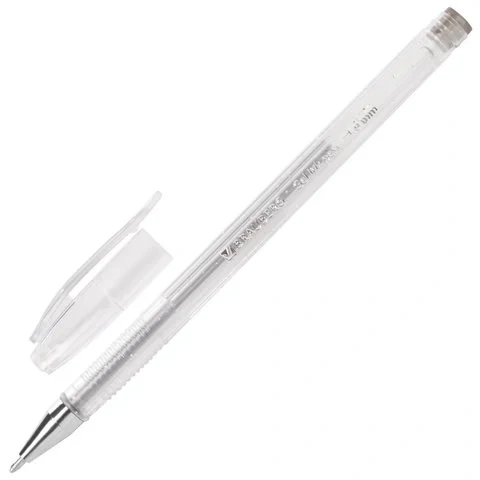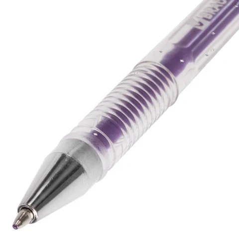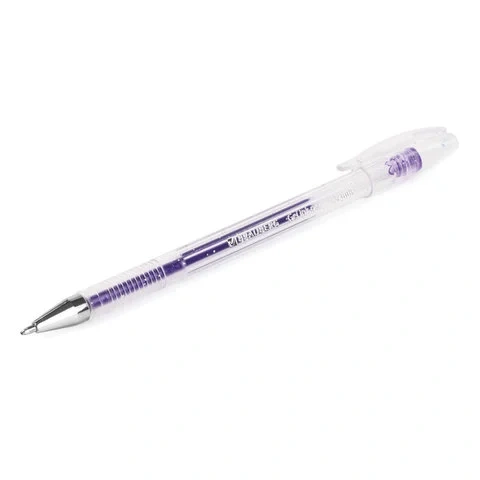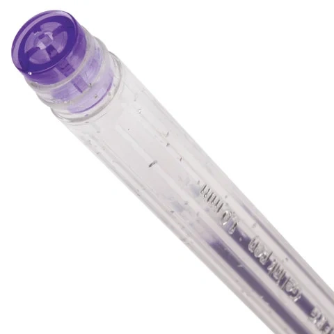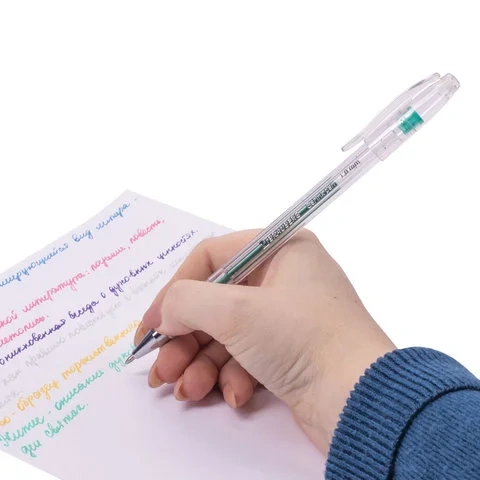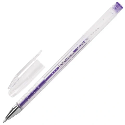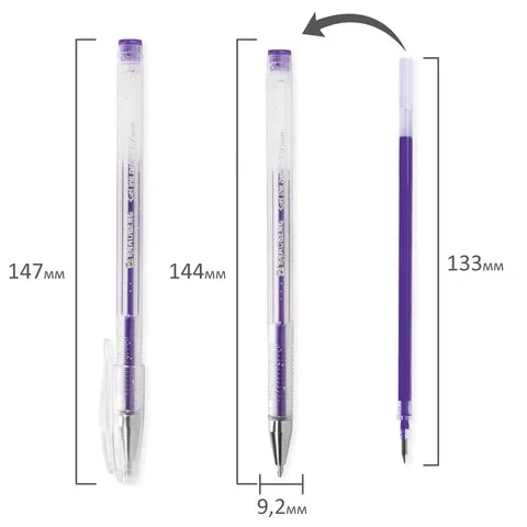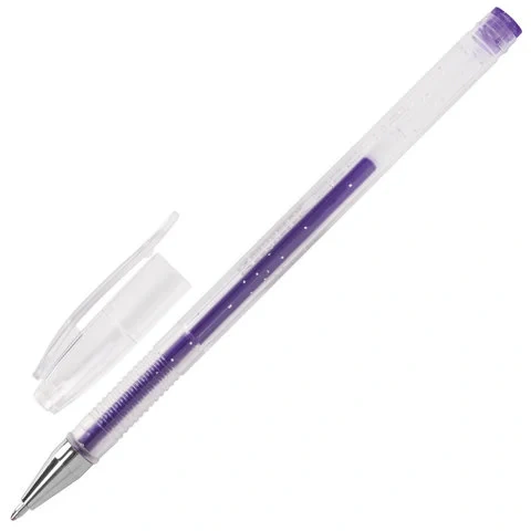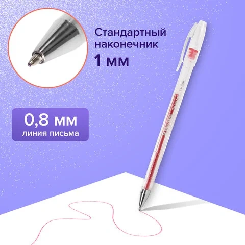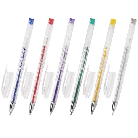 Ручка имеет круглый прозрачный корпус и рифление в зоне захвата для удобства письма. Сменный стержень длиной 135 мм со стандартным наконечником позволит использовать ручку максимально долго. Диаметр пишущего узла, равный 1,0 мм, создает линию письма, равную 0,8 мм. Набор включает гелевые ручки из 6 различных цветов чернил с блёстками: синий, красный, фиолетовый, зеленый, желтый, серебристый. Рекомендован для детского творчества.