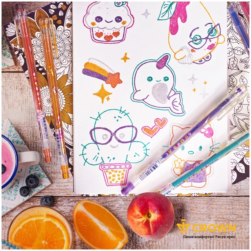 Набор гелевых ручек Crown Glitter Metal Jell с блестками поможет выделить в тексте заголовки и определения или сделать самый яркий рисунок. Диаметр пишущего узла - 1 мм, благодаря чему ручка пишет мягко и без пропусков. Цвет чернил – ассорти 6 штук с блёстками (розовый, оранжевый, желтый, зеленый, синий, фиолетовый). Набор упакован в чехол из ПВХ с европодвесом. Корпус сделан из высококачественного пластика, который при поломке не оставляет мелких осколков. Корейские гелевые чернила на водной основе обладают высокой светостойкостью и водостойкостью, мгновенно высыхают, не смазываются. Благодаря гелеобразным чернилам и специальной технологии пишущего узла гелевые ручки Crown обеспечивают мягкое и комфортное письмо.