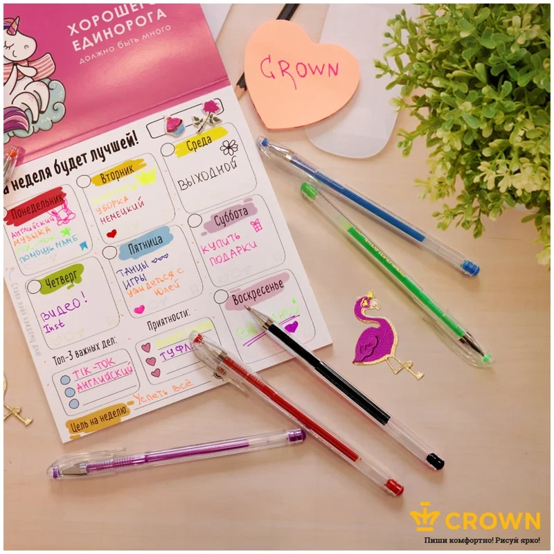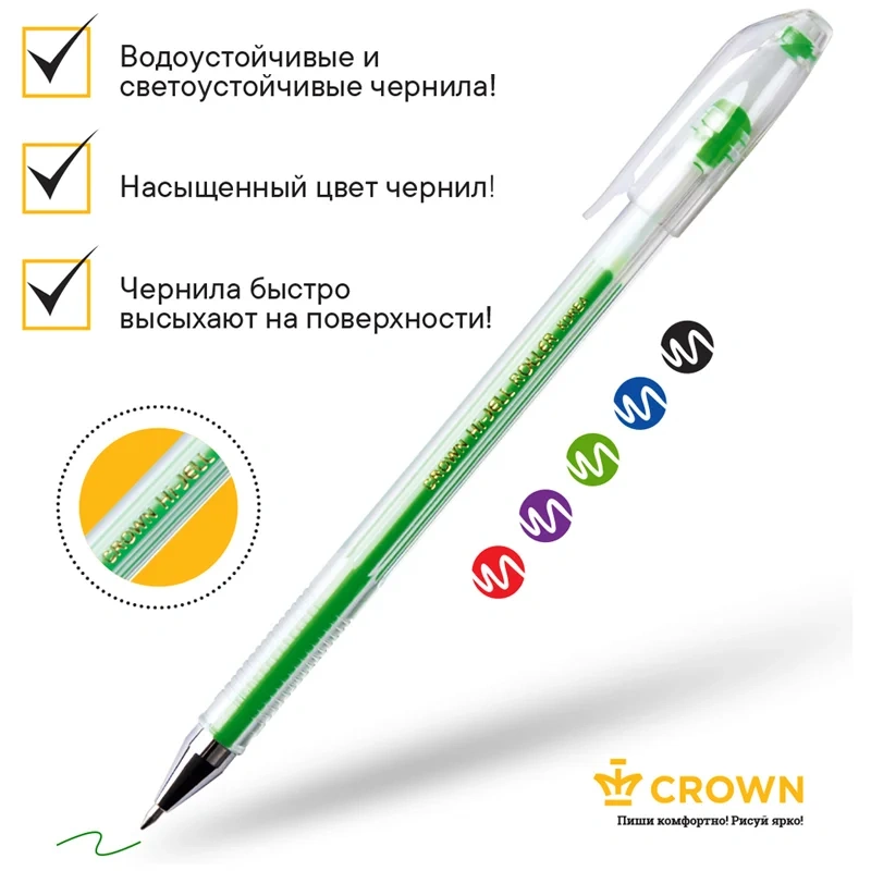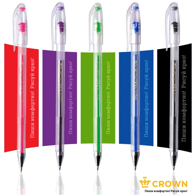 Набор гелевых ручек Crown Hi-Jell Color состоит из 5 ручек разных цветов, включает классические и неоновый фиолетовый тона. С помощью ручек, входящих в данный набор легко реализовать разные задачи, в том числе выделить в тексте заголовки и определения, или сделать самый яркий рисунок. Диаметр пишущего узла - 0,5 мм/0,7 мм (в зависимости от цвета) . Цвет чернил ручек, входящих в набор - красный, фиолетовый, зеленый, синий, черный. Набор упакован в чехол из ПВХ с европодвесом. Корпус ручек выполнен из высококачественного пластика, который при поломке не образует острых углов и не оставляет мелких осколков. Гелевые чернила на водной основе обладают высокой светостойкостью и водостойкостью, мгновенно высыхают, не смазываются. Благодаря гелеобразным чернилам и специальной технологии пишущего узла гелевые ручки Crown обеспечивают мягкое и комфортное письмо.