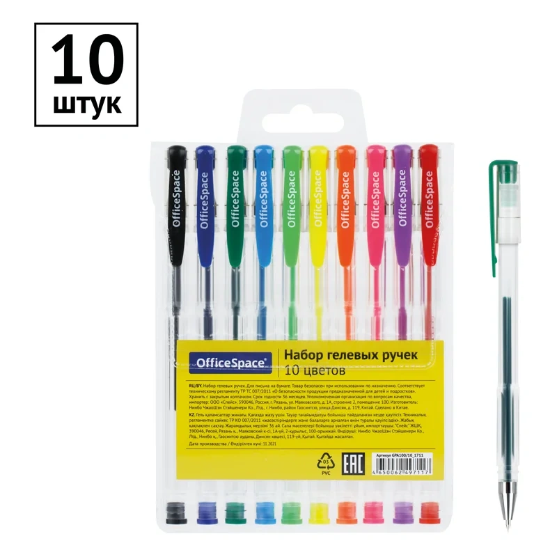 Набор гелевых ручек OfficeSpace – это удобство в использовании и отличное качество. Внутри ручки в прозрачном пластиковом корпусе – гелевые чернила, которые ярко пишут на бумаге. На каждой модели есть колпачок с клипом – можно закрепить её на одежде или тетради. Диаметр пишущего узла 1,0 мм, благодаря чему ручка оставляет широкую линию и мягко пишет без нажима. Цвета чернил: черный, синий, голубой, розовый, зеленый, светло-зеленый, красный, желтый, оранжевый, фиолетовый. В наборе 10 ручек, упаковка – чехол из ПВХ с ероподвесом.