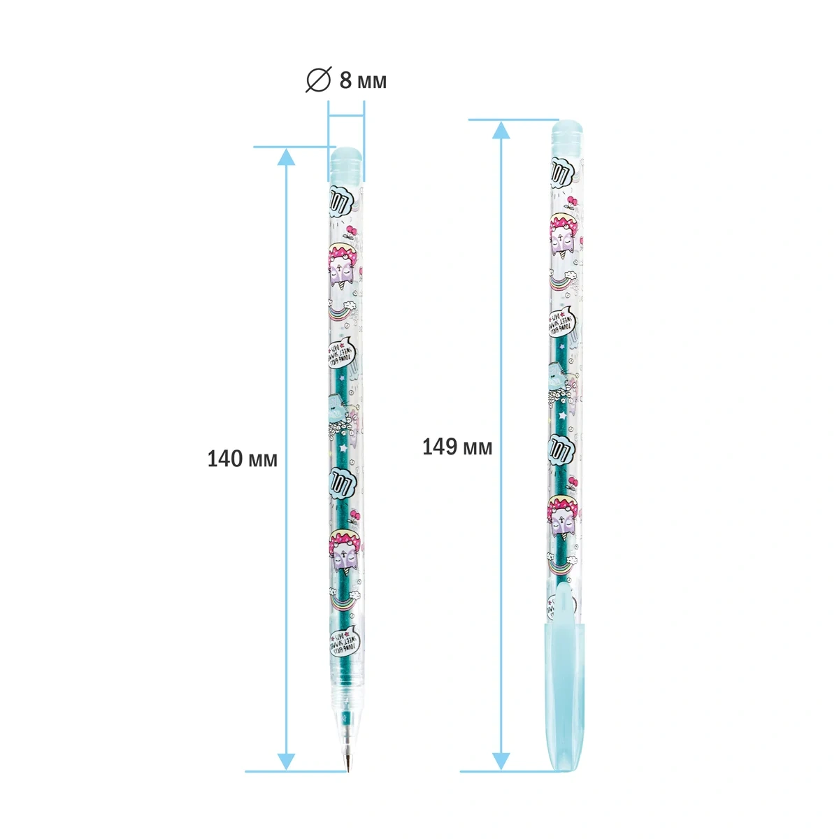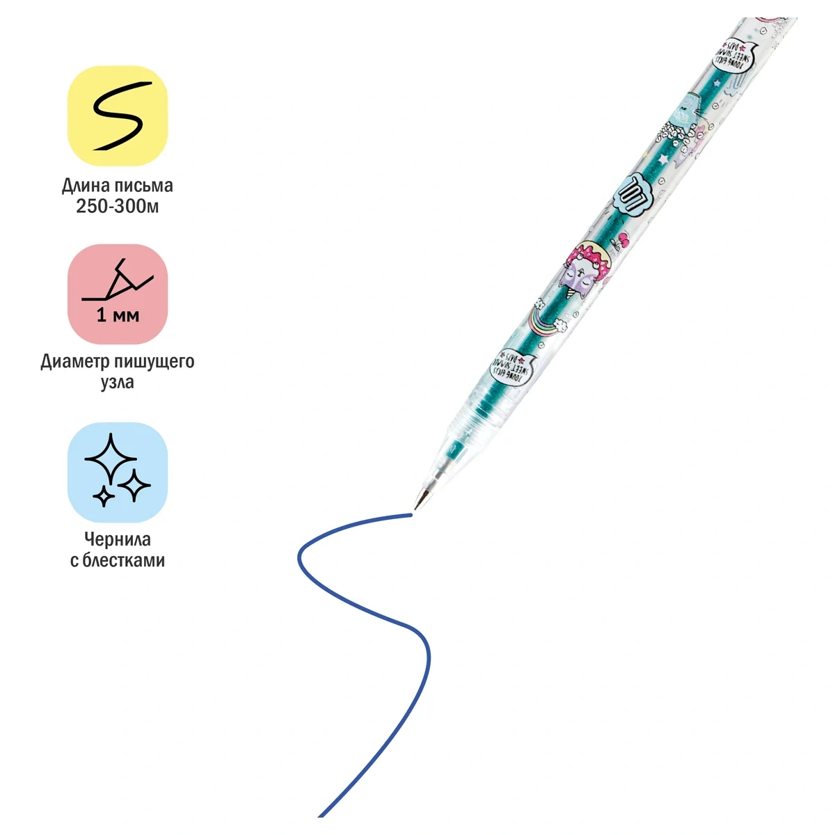Набор гелевых ручек с глиттером, 6 цв., цвет чернил — ассорти, в блистере с ероподвесом размерами 17,5х6,6х1,5 мм. Длина ручки с колпачком 149 мм, без колпачка 140 мм, длина стержня 130 мм. Диаметр корпуса 8 мм. Длина письма 1 ручки 250 - 300 м. Перед использованием рекомендовано встряхнуть ручку вниз пишущим узлом.