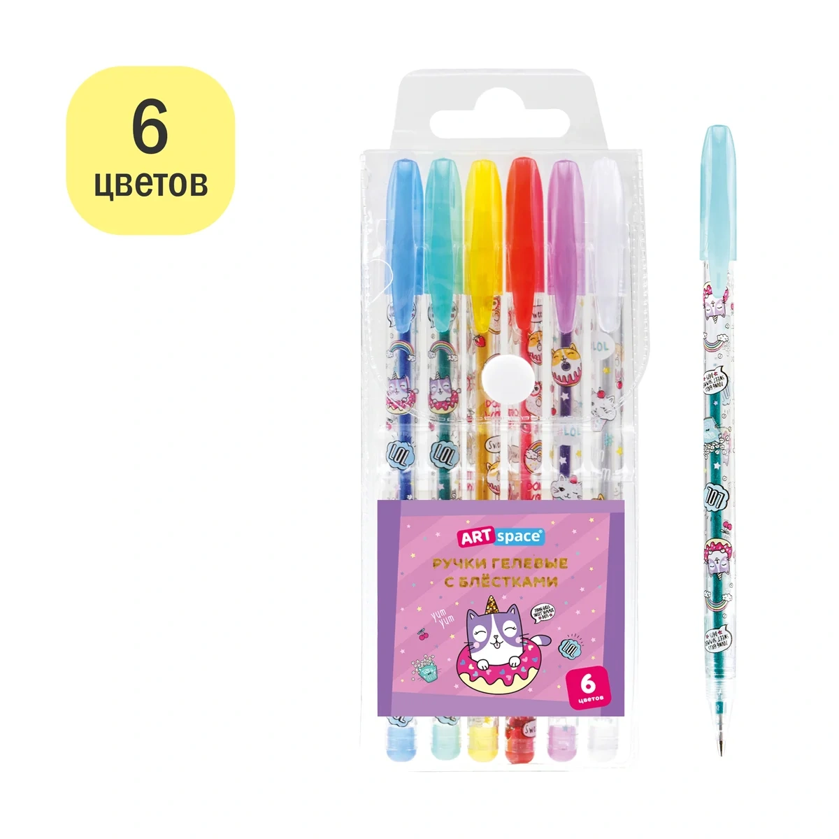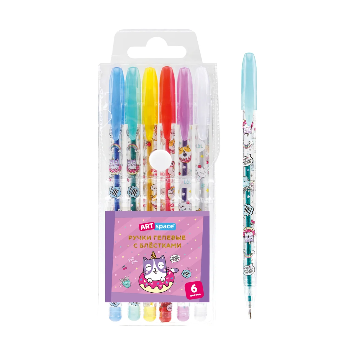 Набор гелевых ручек Artspace Кот-сластена 6 цветов, с блестками, 1мм