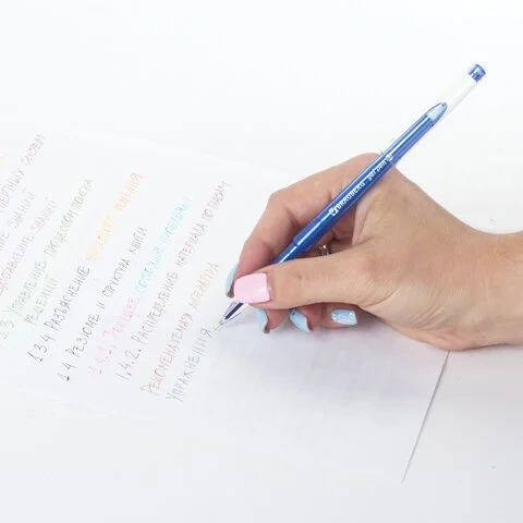 Яркие, приковывающие взгляды ручки станут отличным помощником в создании фантазийных, головокружительных образов. В наборе 12 цветов: зеленый, серый, оранжевый, коричневый, желтый, салатовый, синий, красный, фиолетовый, розовый, темно-розовый, голубой. Цвет чернил соответствует цвету корпуса. Необычный пишущий узел с диаметром наконечника 0,5 мм создает линию письма, равную 0,25 мм.