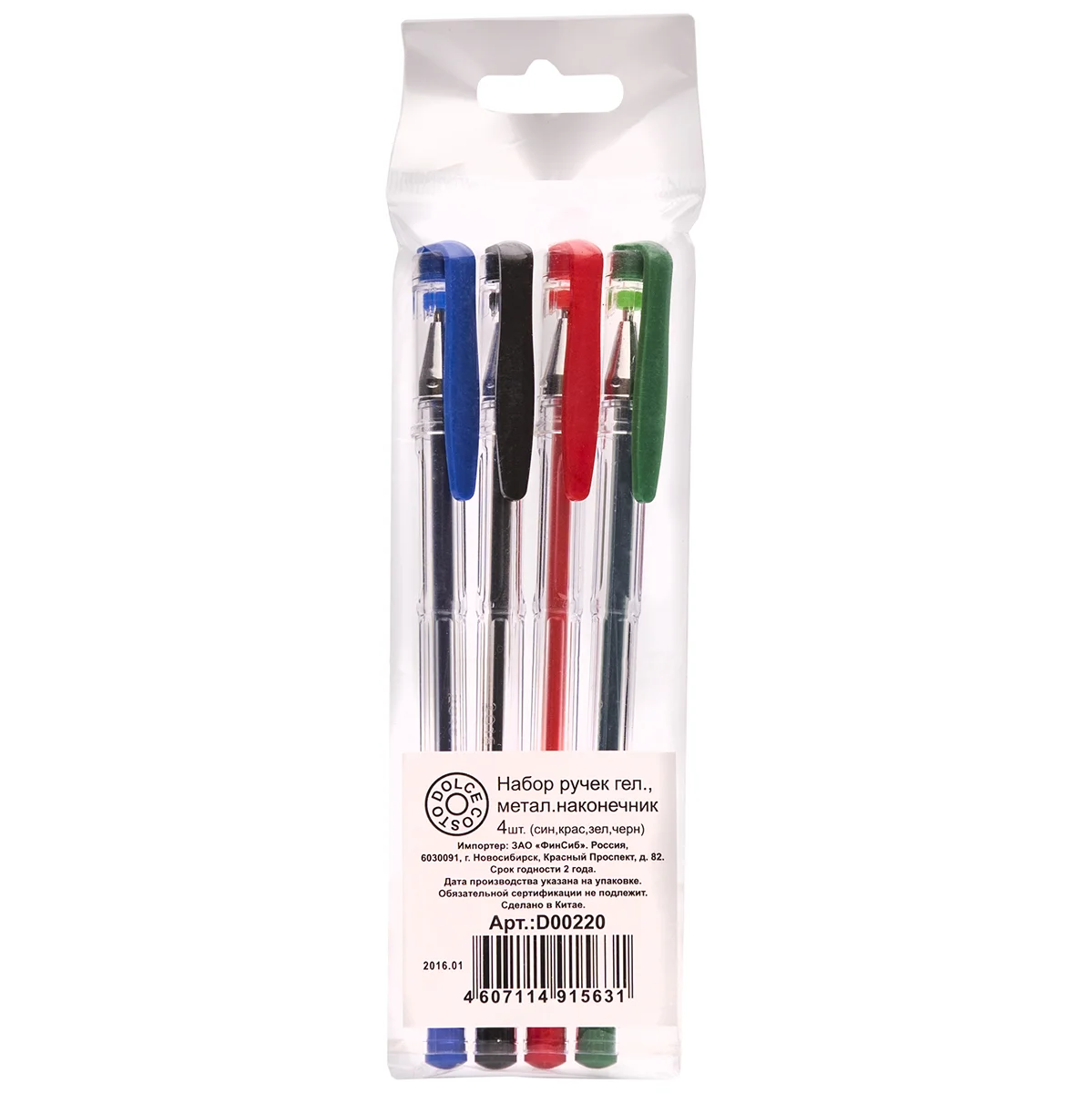 Набор гелевых ручек DOLCE COSTO в пластиковом прозрачном корпусе, 4 цвета (красный, зеленый, синий, черный). Пишущий узел 0,5 мм. Цвет чернил соответствует цвету клипа на колпачке. Упакован в прозрачный пакет с европодвесом.