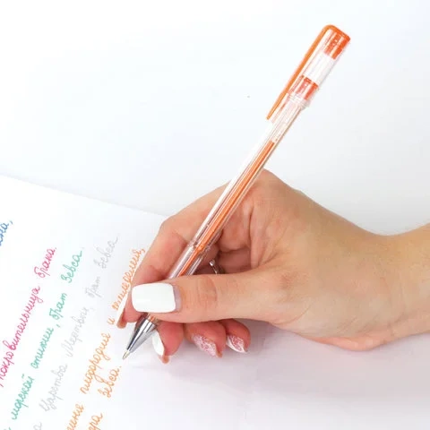Ручка имеет шестигранный прозрачный корпус и удобная трехгранная зона захвата. Сменный стержень длиной 130 мм со стандартным наконечником позволит использовать ручку максимально долго. Диаметр пишущего узла, равный 0,7 мм, создает линию письма, равную 0,5 мм. Набор включает гелевые ручки из 6 необычных цветов чернил с блестками: серебряный, оранжевый, зеленый, красный, желтый, синий.