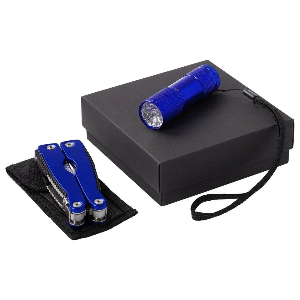 В набор входит: Мультитул Scout, синий Фонарик Aurora, синий Набор упакован в коробку из дизайнерского картона с флокированным ложементом. Цвет - синий. Размер: 13,6х13,9х4,6 см. Материал: фонарик - алюминий; мультитул: инструменты - нержавеющая сталь; рукоятки - алюминий; чехол - полиэстер; коробка - картон. Возможные виды нанесения: Наклейка; Лазерная гравировка; Шелкография с трансфером; Шелкография (1 цвет)