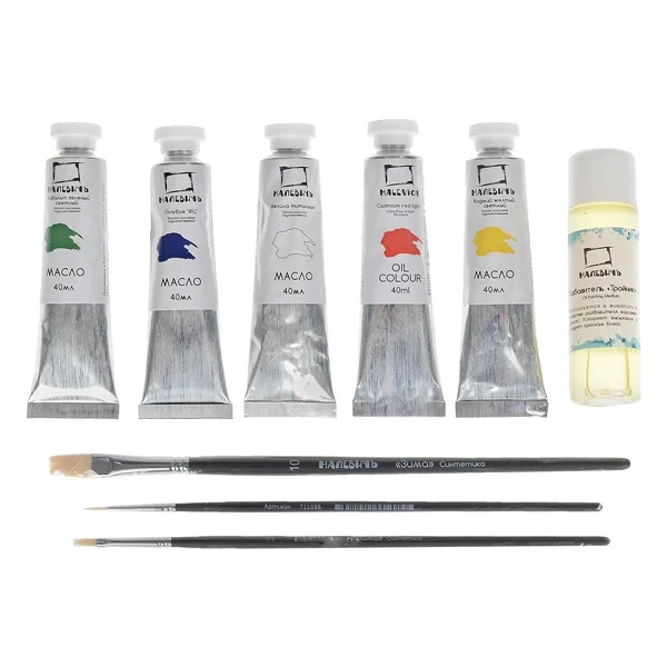 Набор художественный Малевичъ Стартовый для живописи маслом, 5 цветов х 40мл, разбавитель 50мл, 1 холст, 3 кисти, мольберт