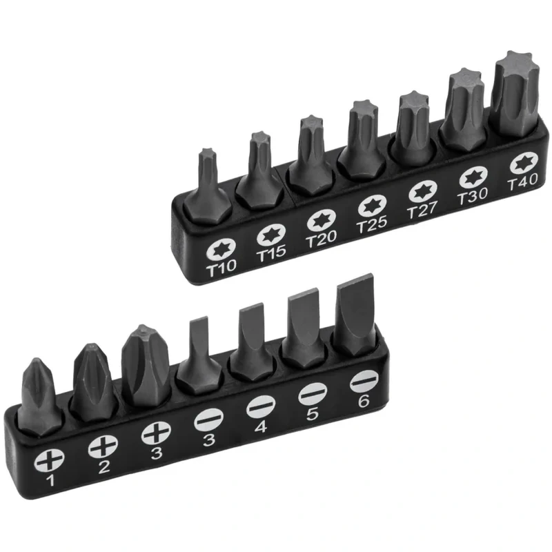 Биты: Т10, Т15, Т20, Т25, Т27, Т30, T40, SL3, SL4, SL5, SL6, PH1, PH2, PH3;
