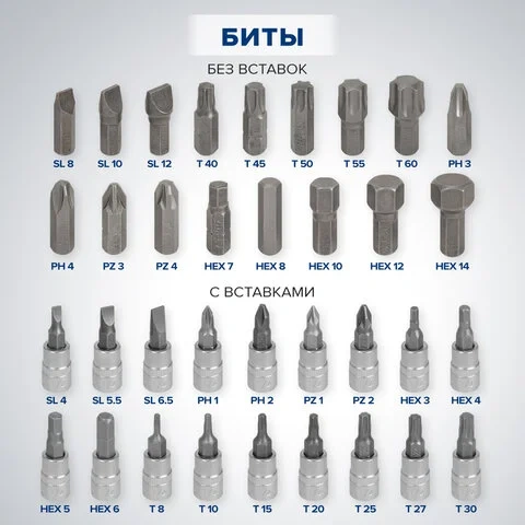 17 ШТ. - БИТЫ (SL: 8, 10, 12; T: 40, 45, 50, 55, 60; PH: 3, 4; PZ: 3, 4; HEX: 7, 8, 10, 12, 14)