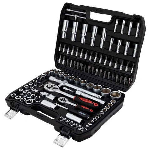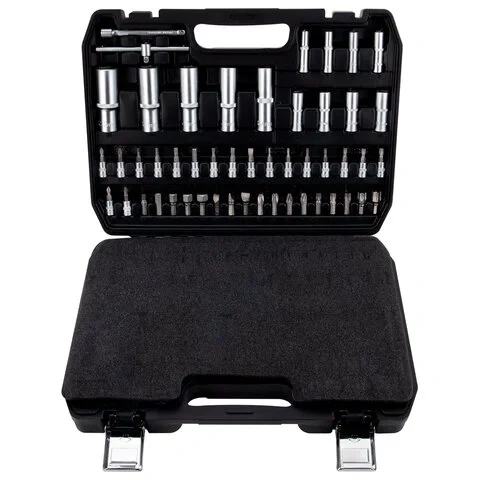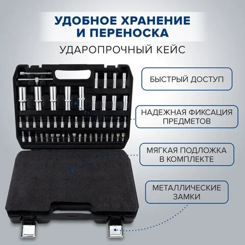 Инструменты размещены в ударопрочном кейсе с металлическими застёжками и ручкой для удобной переноски. Каждый элемент прочно зафиксирован внутри и не выпадает при транспортировке. Углубления для бит и торцевых головок промаркированы по размеру, что облегчает поиск нужного инструмента.