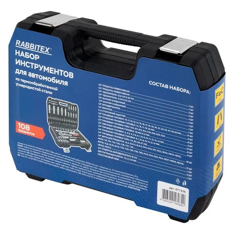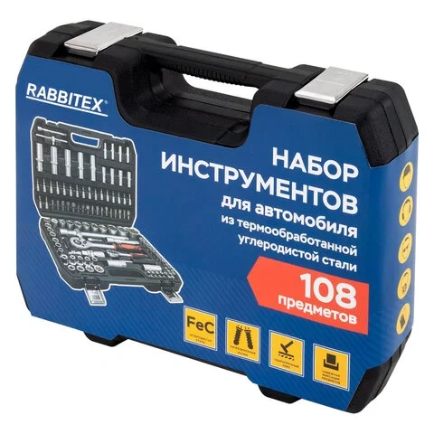 Набор инструментов для автомобиля, 108 предметов, пластиковый кейс, RABBITEX (РАББИТЕКС), 671339