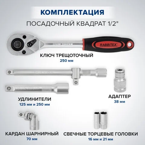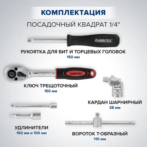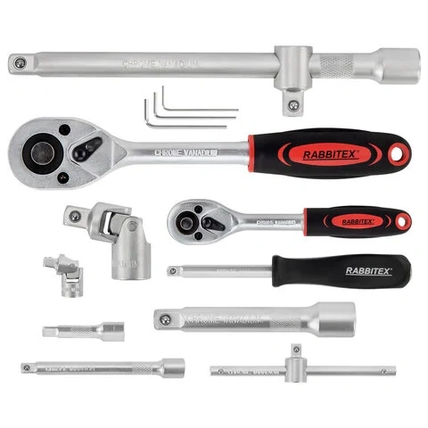 Инструменты RABBITEX изготовлены из высококачественной углеродистой стали и подходят для работы с различными видами крепежа. В набор входят ключевые приспособления для ремонта автомобилей, колесной и бытовой техники, а также мебели. Две реверсивные трещотки с разными посадочными квадратами, удлинители, адаптеры и шарниры обеспечивают доступ к креплениям и узлам даже в труднодоступных местах.