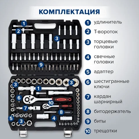| Комплектация набора | адаптер, битодержатель, биты, ключ трещоточный, комбинированный удлинитель, переходники, свечные гол |