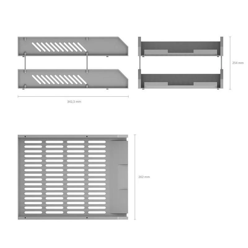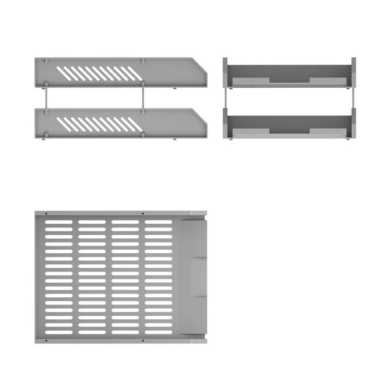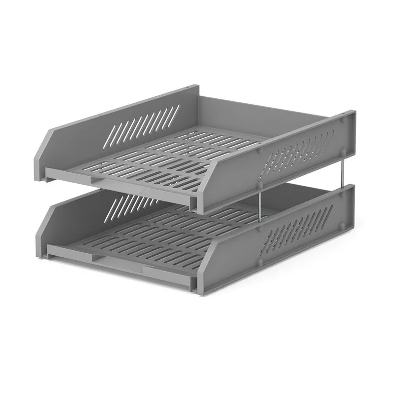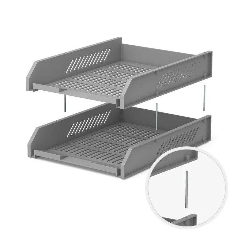 Набор из двух пластиковых лотков, соединенных четырьмя металлическими штифтами. Увеличенное расстояние между лотками создает дополнительные удобства при работе с бумагами. Возможна установка лотков в несколько ярусов. Лотки не скользят и не царапают поверхность стола. Цвет серый.