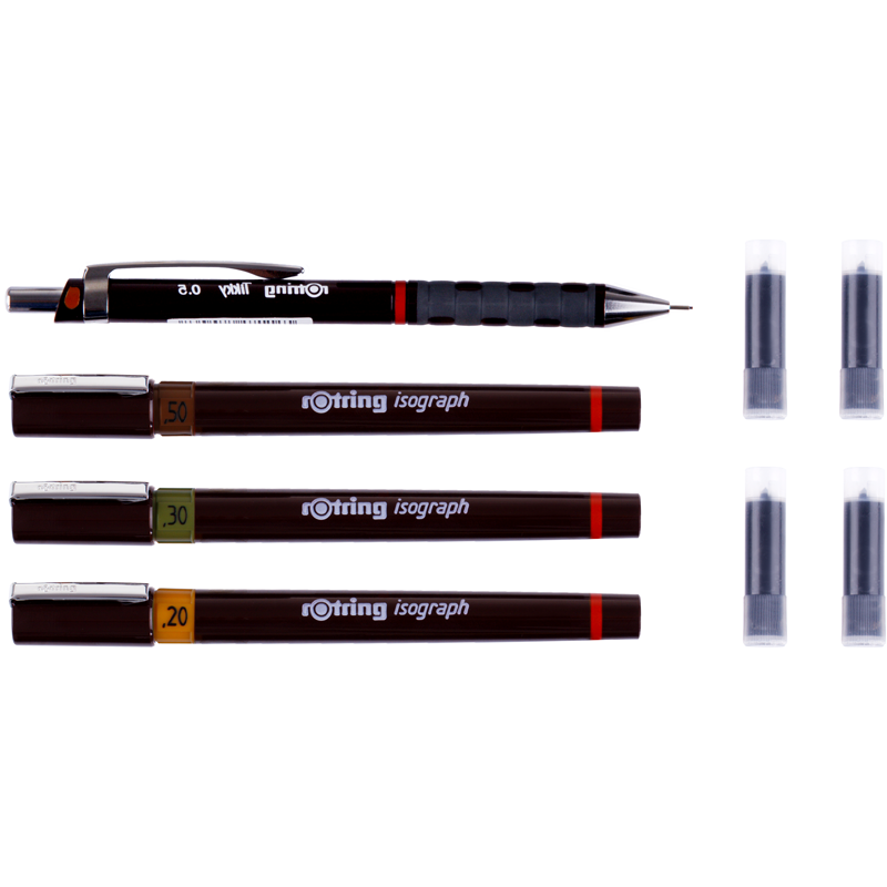 Набор изографов rotring. В наборе: 3 изографа 0.2, 0.3, 0.5 мм;механический карандаш Tikky 0.5 мм; 4 картриджа с чернилами.Набор изографов позволяет использовать одновременно несколько ручек с разными линиями письма.Механический карандаш Tikky собран из прочного пластикового корпуса с резиновый зоной захвата обеспечивает комфортную работу без устали. Наконечник карандаша оснащён тонкой металлической втулкой для защиты грифеля и удобной работы с линейкой и другими чертёжными инструментами, латунный механизм гарантирует максимально точную подачу грифеля.