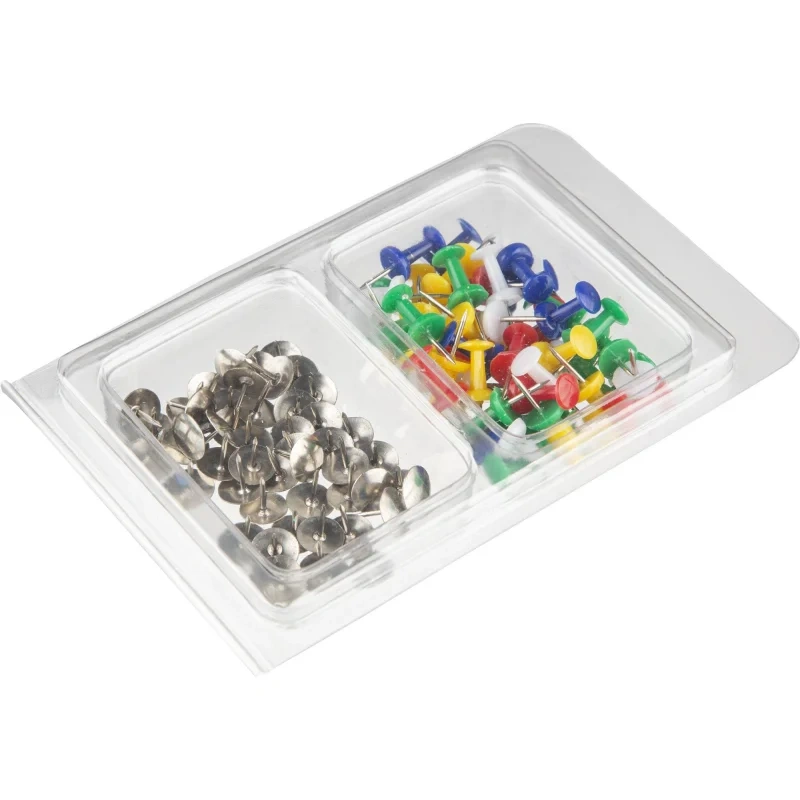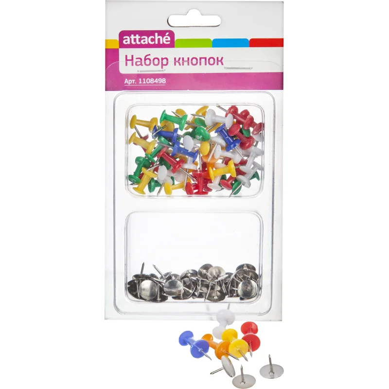 Набор канцелярский Attache 2отд.(кнопки канцеляр 50шт, кнопки силовые 50шт) Набор кнопок Attache состоит из канцелярских кнопок и кнопок для пробковых досок, каждых по 50 штук. Канцелярские кнопки серебристого цвета с металлической шляпкой диаметром 9,5 мм и металлической игольчатой ножкой. Кнопки для пробковых досок с цветной пластиковой шляпкой диаметром 8 мм и металлической игольчатой ножкой. Кнопки предназначены для крепления бумаги и фотографий к различным поверхностям. Набор поставляется в блистерной упаковке с картонным подвесом.