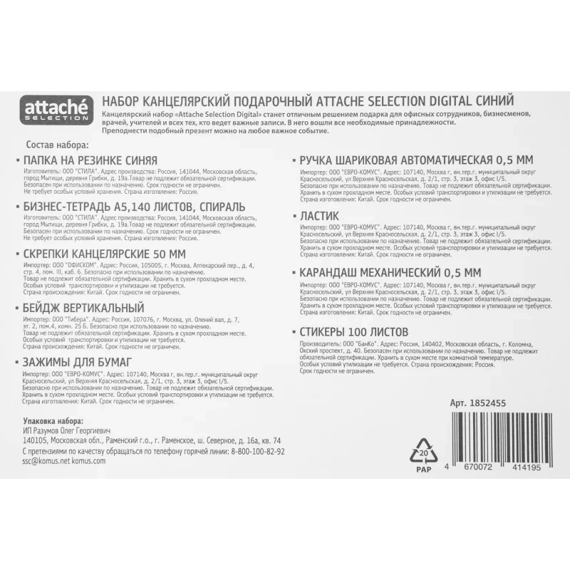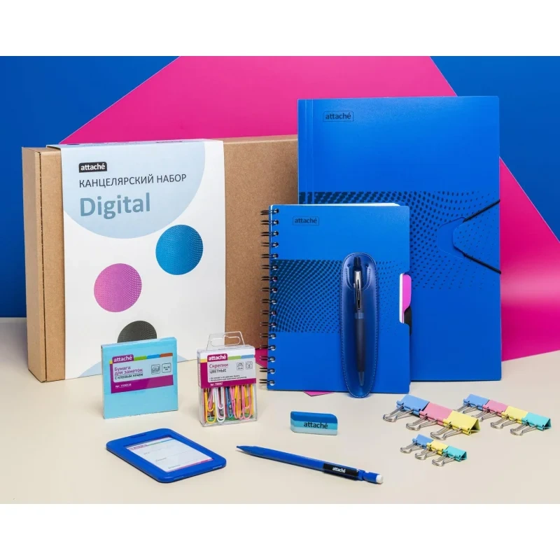 Набор канцелярский подарочных Attache Selection Digital синий Канцелярский набор Attache Selection Digital Канцелярский набор Attache Selection Digital станет отличным решением для офисных сотрудников, бизнесменов, врачей, учителей и всех тех, кто ведет важные записи. Этот набор вместил в себя все самые полезные и необходимые предметы.Состав набора:- бейдж,- механический карандаш (обеспечивает мягкое и качественное письмо),- ластик (выполнен из безопасного материала),- папка на резинках (вместительная, сохраняет важные документы и бумаги, помогает организовать порядок),- шариковая ручка (автоматическая, плавное письмо и тонкие линии на бумаге, удобна для подписания договоров),- стикеры,- зажимы. Преподнести подобный презент можно на любое важное событие - день рождения, День учителя, профессиональные праздники, Новый год, Восьмое марта и другие. Главным преимуществом канцелярских принадлежностей в наборе Attache Selection Digital выступает их изготовление из качественных и безопасных материалов. Здесь есть все необходимо для учебы, работы или личных записей. С помощью набора можно организоваться порядок и хранение документов, важных бумаг, записей. Пользоваться им удобно и комфортно. К тому же все изделия характеризуются долгим сроком службы. Если вы ищете подарок для брата, сестры, мамы, коллеги, начальника, то обратите внимание на канцелярский набор Attache Selection Digital! Он станет удобным и полезным помощником для своего владельца, как на работе, так и дома.