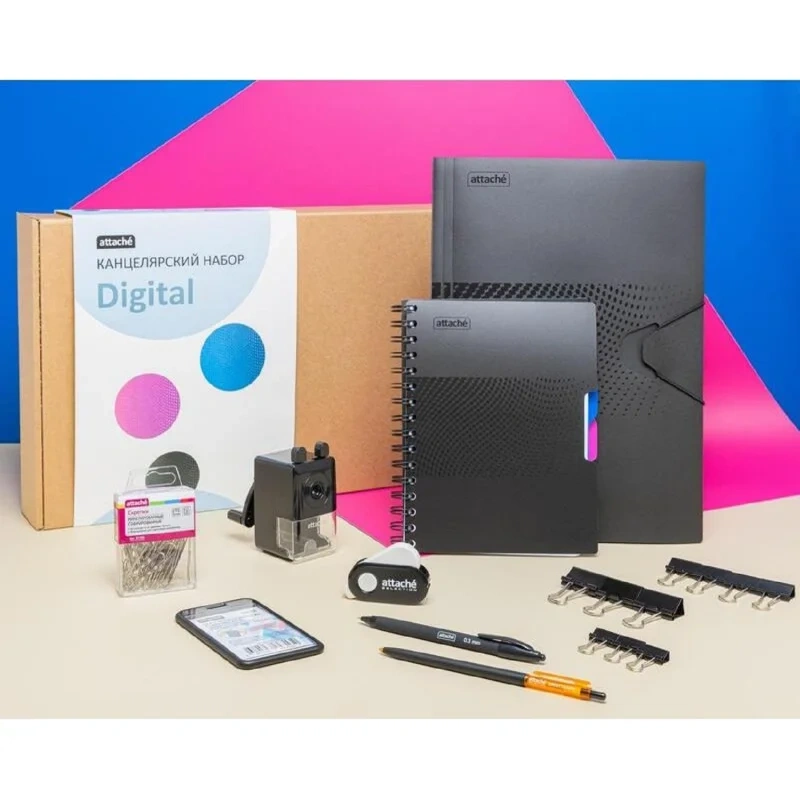 Набор канцелярский подарочный Attache Selection Digital черный Канцелярский набор Attache Selection Digital Канцелярский набор станет отличным решением для офисных сотрудников, бизнесменов, врачей, учителей и всех тех, кто ведет важные записи. В него вошли все необходимые принадлежности. Этот набор вместил в себя все самые полезные и необходимые предметы.Состав набора:- бизнес-тетрадь (для комфортного ведения записей и планирования рабочих процессов),- бейдж,- механический карандаш (обеспечивает мягкое и качественное письмо),- ластик (выполнен из безопасного материала),- папка на резинках (вместительная, сохраняет важные документы и бумаги, помогает организовать порядок),- шариковая ручка (автоматическая, плавное письмо и тонкие линии на бумаге, удобна для подписания договоров),- стикеры,- зажимы,- механическая точилка. Преподнести подобный презент можно на любое важное событие - день рождения, День учителя, профессиональные праздники, Новый год, Восьмое марта и другие. Главным преимуществом канцелярских принадлежностей в наборе Attache Selection Digital выступает их изготовление из качественных и безопасных материалов. Здесь есть все необходимо для учебы, работы или личных записей. С помощью набора можно организоваться порядок и хранение документов, важных бумаг, записей. Пользоваться им удобно и комфортно. К тому же все изделия характеризуются долгим сроком службы. Если вы ищете подарок для брата, сестры, мамы, коллеги, начальника, то обратите внимание на канцелярский набор Attache Selection Digital! Он станет удобным и полезным помощником для своего владельца, как на работе, так и дома.