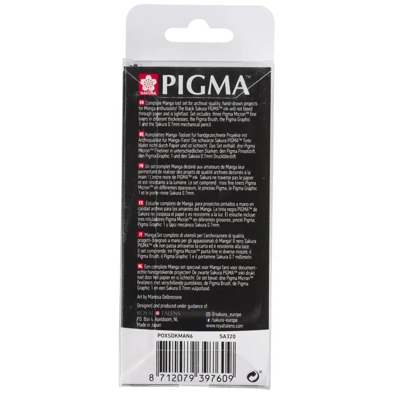 Набор капиллярных ручек Sakura Pigma Manga 6 предметов (ручки Pigma + мех. карандаш) в блистере - Всё, что нужно для рисования в стиле Манга в одном наборе - В наборе: - 3 черные капиллярные ручки Sakura Pigma Micron: 01 (пишущий узел 0,25мм), 03 (пишущий узел 0,35мм) 05 (пишущий узел 0,45мм) - 1 черная капиллярная ручка Sakura Pigma Brush (наконечник-кисть) - 1 механический карандаш Sakura 0,7мм - Размер: 16,5см*6,6см*1,6см - Масса: 60 грамм - В ручках серии Pigma используются архивные чернила Pigma Ink: светостойкие (не выцветают), химически стабильные, на водной основе и пигментах. После высыхания устойчивы к воздействию воды (не расплываются при попадании на воды на бумагу), не пачкаются, не смазываются и не проступают на оборотную сторону листа (для большинства видов бумаги) - Применение Sakura Pigma Micron в творчестве: - Смешанные техники: используют совместно с акварелью, акрилом, карандашами и прочими художественными материалами - Скетчинг - Иллюстрация и мультипликация - Комиксы и манга - Различные виды хобби: скрапбукинг, создание авторских открыток, пригласительных и штампов (Rubber Stamping), роспись кукол, квилтинг, и другие - Медитативная техника рисования Zentangle - Декоративная роспись по ткани (предпочтительно, хлопок, ткань с рисунком не рекомендуется стирать) - Применение Sakura Pigma Micron в работе и повседневной жизни: - Ежедневное письмо: ведение ежедневников, дневников, журналов, запись лекций - Подпись официальных документов - Черчение - Технический рисунок - Ручки Sakura Pigma Micron не токсичны по стандартам ACMI (Art & Creative Materials Institute), организации, специализирующейся на проверке товаров для художников и хобби на предмет безопасности и токсичности - Не применять для косметических целей - В ручках серии Pigma используются архивные чернила Pigma Ink: светостойкие (не выцветают), химически стабильные, на водной основе и пигментах. После высыхания устойчивы к воздействию воды (не расплываются при попадании на воды на бумагу), не пачкаются, не смазываются и не проступают на оборотную сторону листа (для большинства видов бумаги)