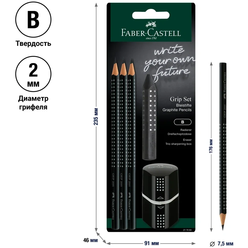 Стильный набор от Faber-Castell содержит три ч/г карандаша Grip 2001, твердостью В, в черном цвете. Запатентованное покрытие корпуса делает карандаш 'Grip 2001' уникальным. Его трехгранная форма снижает напряжение руки, а нанесенный на корпус объемный рисунок предотвращает скольжение пальцев. Корпус покрыт экологически чистым лаком на водной основе. Благодаря специальной технология крепления грифеля SV предотвращает поломку при падении и затачивании. Набор также содержит ластик и точилку. Ластик Grip 2001 имеет узнаваемый запатентованный дизайн Grip и имеет удобную трехгранную форму. Мягко удаляет следы от чернографитных карандашей. Не содержит ПВХ и вредного фталатного пластификатора, благодаря чему безопасен для использования. Точилка Trio Grip 2001 в узнаваемом запатентованном дизайне Grip. Уникальна тем, что имеет 3 отверстия для цветных и чернографитовых карандашей стандартного, а также утолщенного размера. 3 точилки в 1! Два плотно закрывающихся контейнера для сбора стружек. Цвет набора: черный. Данный набор станет желанным подарком. Содержит незаменимые аксессуары для школьников и студентов для стильного и комфортного письма.