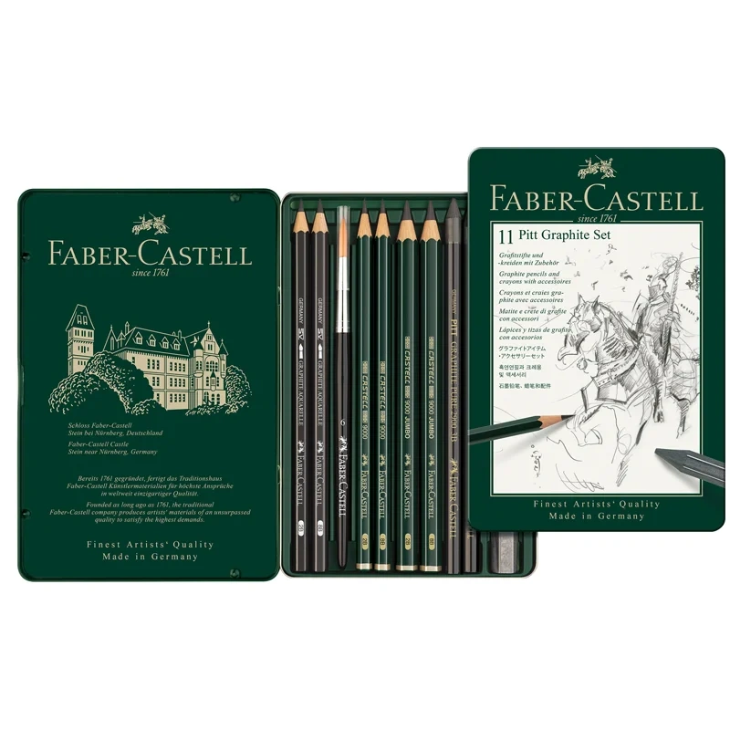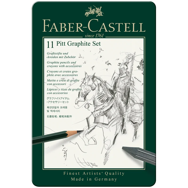 Набор профессиональных художественных чернографитных письменных принадлежностей Pitt Graphite от легендарного немецкого производителя Faber-Castell состоит из 11 предметов: