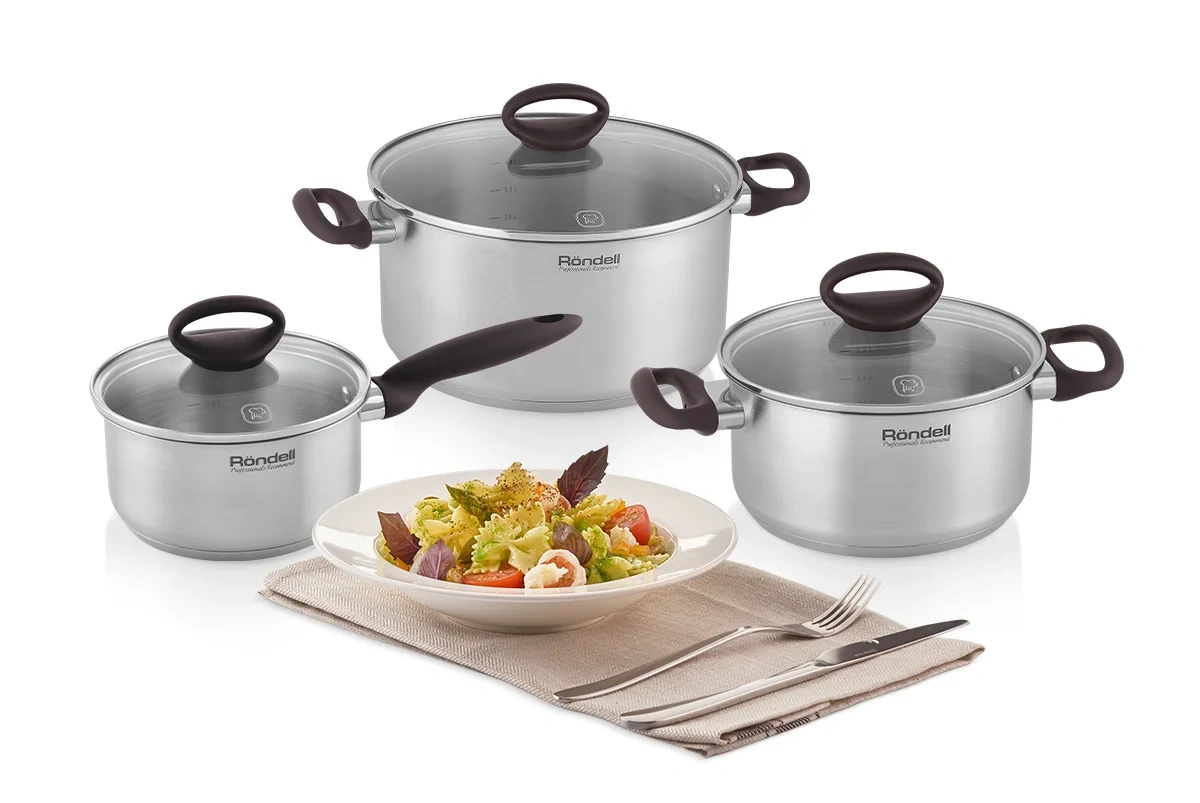 Набор кастрюль Rondell Tierno, 6 предметов, который будет идеально смотреться на любой кухне. Строгий благородный дизайн сковород, сотейника, вока, выполненных из надежного кованого алюминия, покоряет с первого взгляда и пробуждает фантазию. Будьте уверены в идеальном результате вашего кулинарного творчества: внутреннее двухслойное покрытие всех предметов посуды Xylan Plus от PPG, абсолютно безопасное для здоровья, обладает превосходными антипригарными свойствами. В состав коллекции также входят кастрюли и ковш из высококачественной нержавеющей стали, дополненные стеклянными крышками с отверстиями для выхода пара. Особому комфорту в использовании посуды Tierno способствуют бакелитовые ручки с покрытием soft touch: они не нагреваются в процессе приготовления пищи и не требуют прихваток. Посуда подходит для всех видов плит, включая индукционные. Объем кастрюль: 2,8 л, 4,8 л. Объем ковша: 1,4 л. Толщина дна и стенок: 5 мм. Все предметы из набора можно очищать в посудомоечной машине. Это отличное приобретение для себя и идеальный подарок всем ценителям качественной посуды.