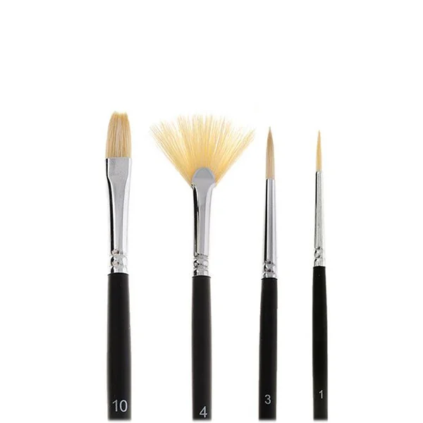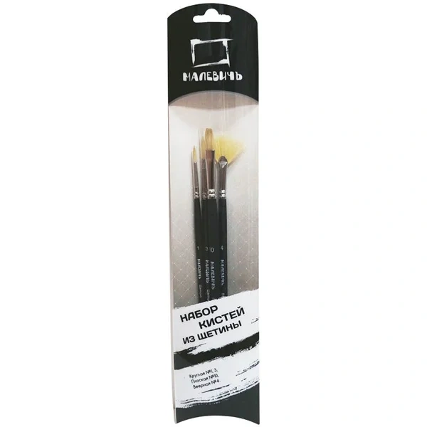 В комплект кистей из щетины Малевичъ для классической живописи входят широкая плоская кисть №10, хорошо подходящая как для заливки больших участков полотна, так и для создания четких широких мазков; универсальная круглая кисть №3; тонкая круглая кисть №1 для прорисовки контуров и работы с мельчайшими деталями картины, а также специальная веерная кисть №4 , позволяющая делать растяжки цвета, смягчать контуры изображения и создавать интересные спецэффекты.