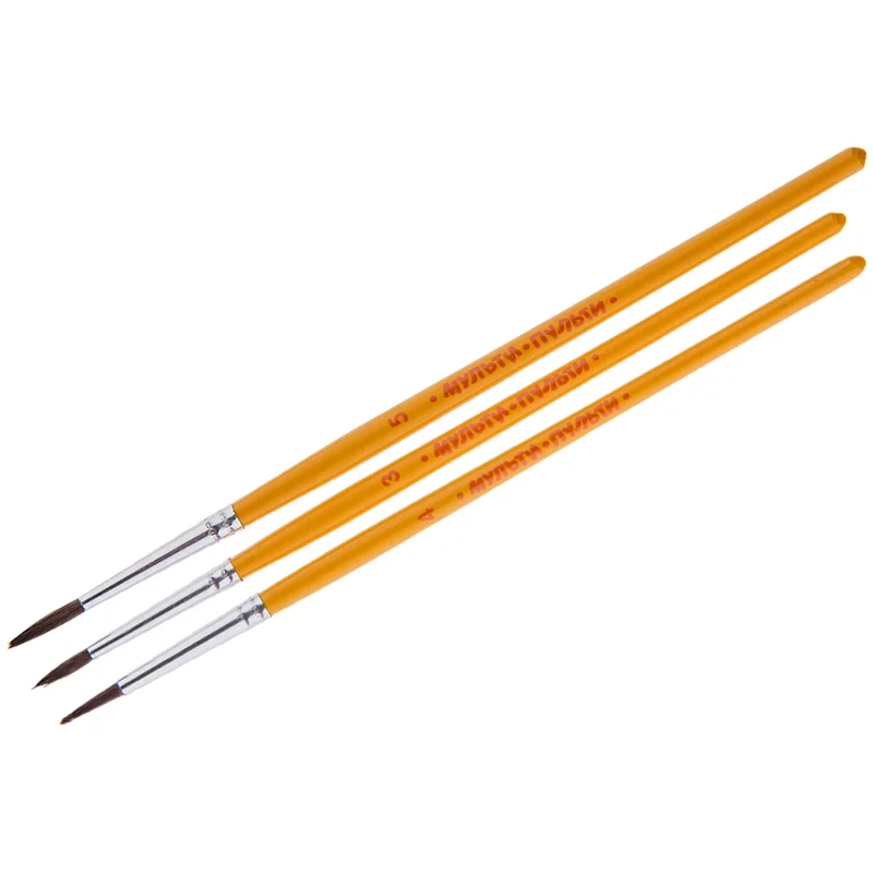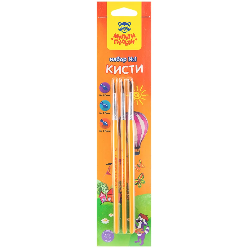 Набор художественных кистей для рисования «Мульти-Пульти» изготовлен из волоса пони. Он несколько толще, чем у белки, расстояние между волосками больше, поэтому воду такая кисточка набирает меньше. Кисти круглой формы с короткими деревянными ручками подходят для детей от 3 лет. В наборе представлено 3 шт: №3,4,5. Товар упакован в блистер с европодвесом.