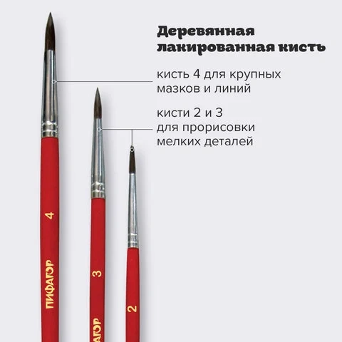Кисти из волоса пони отлично впитывают и отдают краску, хорошо держат форму, долговечны и надежны. Благодаря кистям № 2 и 3 ребенку будет комфортно прорисовывать мелкие детали. Кисть № 4 позволит делать более крупные мазки и линии. Деревянную лакированную рукоятку кисти удобно держать в руке.
