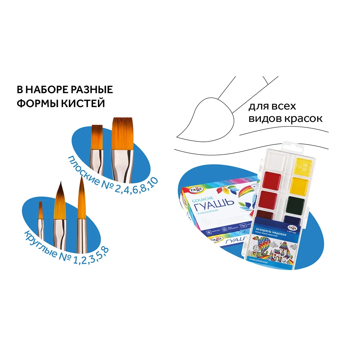 Набор кистей «ГАММА» серии «Классические» прекрасно подойдёт для различных видов красок. Кисти упакованы в красивый яркий блистер и станут незаменимыми помощниками для школьников и педагогов, а также хорошим подарком всем, кто увлекается живописью.