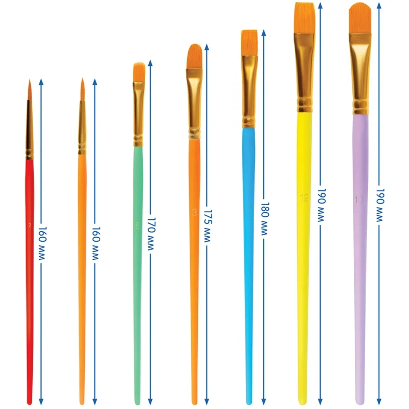 Кисти из набора «Мульти-Пульти» предназначены для детей с начальным и средним уровнем подготовки. В набор входят: круглые (№ 2, 3), плоские (№ 3, 6, 7, 12) и плоскоовальные кисти (№ 10, 3).