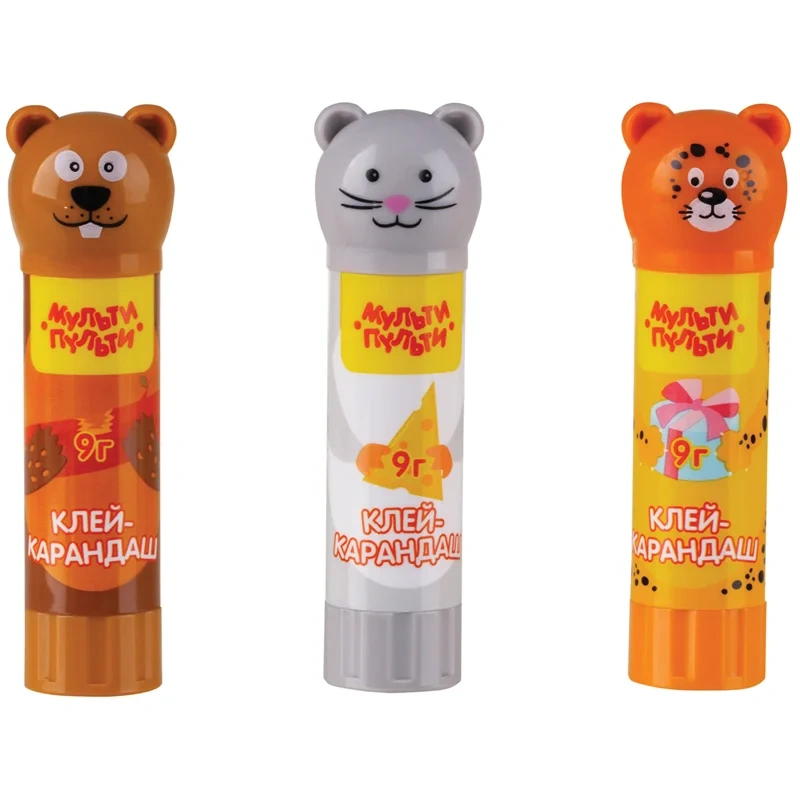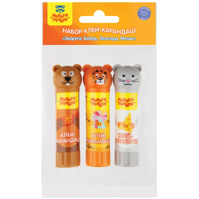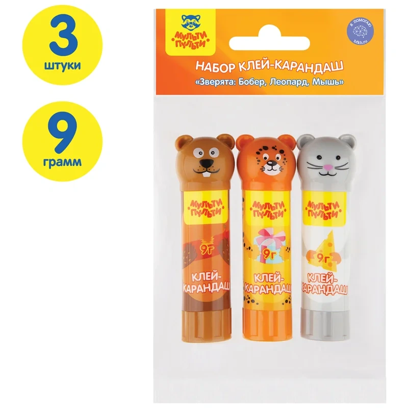 Набор клей-карандаш Мульти-Пульти 'Зверята: Бобер, Леопард, Мышь', 09г, колпачок в форме животного,