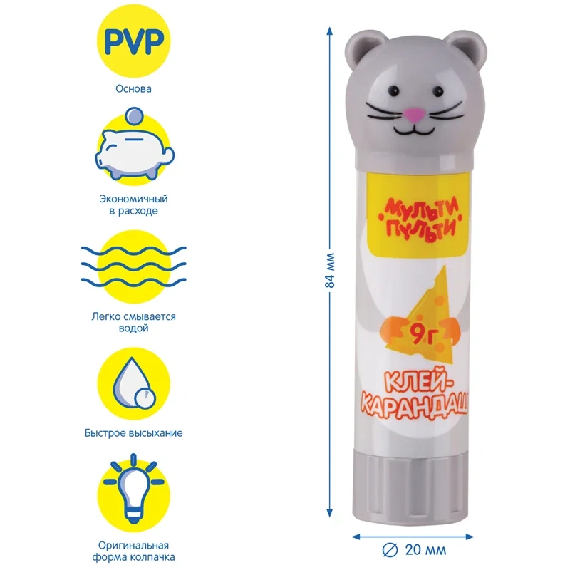 Клей-карандаш «Мульти-Пульти» серии «Зверята: Бобёр, Леопард, Мышь» с колпачком в форме животных – незаменимый помощник на уроках труда и занятиях творчеством. В набор входит 3 клея-карандаша по 9 граммов. Улучшенная формула на основе ПВП позволяет хорошо склеивать изделия из бумаги, картона, ткани. Клей быстро сохнет, нейтрален по запаху, легко смывается водой, не токсичен. Состав не содержит растворителей. Экономичный расход позволяет заниматься творчеством каждый день. Колпачки в форме зверей подойдут для пальчиковых игр. Милые бобёр, леопард и мышь будут поднимать настроение в процессе творчества, создавая особое настроение. Набор упакован в пакет с еврослотом. Вы также можете собрать всех двенадцать персонажей клея-карандаша из коллекции «Зверята», докупив дополнительные наборы бренда «Мульти-Пульти».