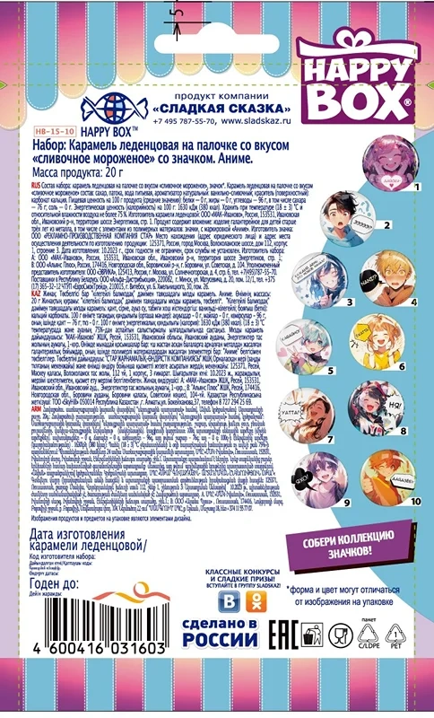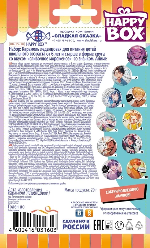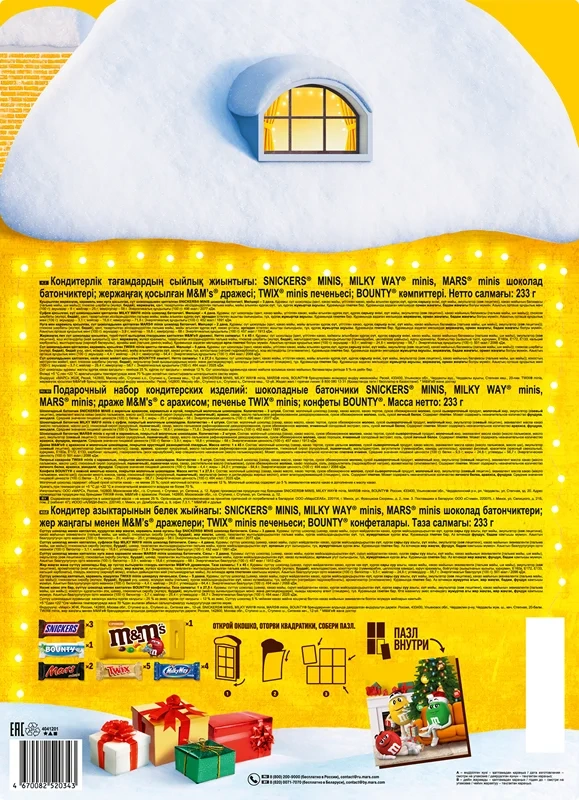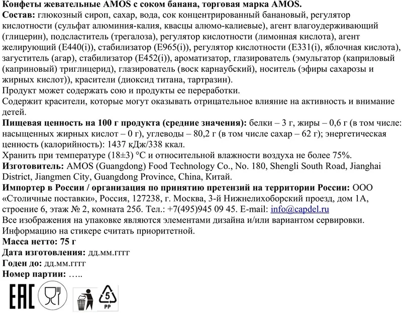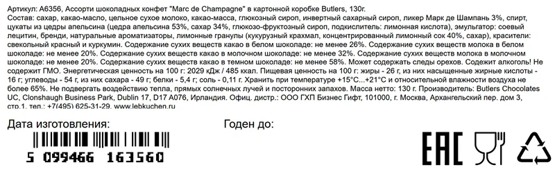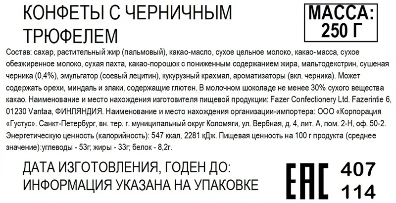 Глазурь кондитерская сахар белый, заменитель масла какао, нетемперируемый лауринового типа, рафинированное дезодорированное гидрогенизированное фракционированное пальмоядровое масло, эмульгаторы Е492, Е322, какао-порошок, ароматизатор Ванилин, сахар белый, жир растительный кокосовое масло, ядро арахиса жареное дробленое, мука соевая обезжиренная дезодорированная, ядро ореха фундука, сухая молочная сыворотка, кокосовая стружка, содержит консервант диоксид серы, рис воздушный, мука крупа рисовая, мука пшеничная хлебопекарная, сахар, соль, патока крахмальная, вода питьевая, пюре из яблок (яблоки свежие, аскорбиновая кислота), эмульгатор Е322, ароматизаторы Ванилин, Фундук, Кофе, Амаретто, Клюква, соль поваренная пищевая йодированная, агент антислеживающий Е536, йодат калия, желирующий агент пектин яблочный, регуляторы кислотности лимонная кислота и цитрат натрия, комплексная пищевая добавка с красителями (Михромовый красный, Е1520, Е150d, Е120, Е160с), эмульгаторы Е433, Е322, стабилизатор Е415, консервант сорбат калия.