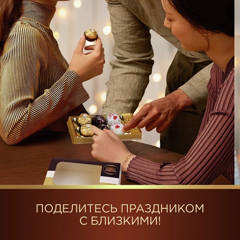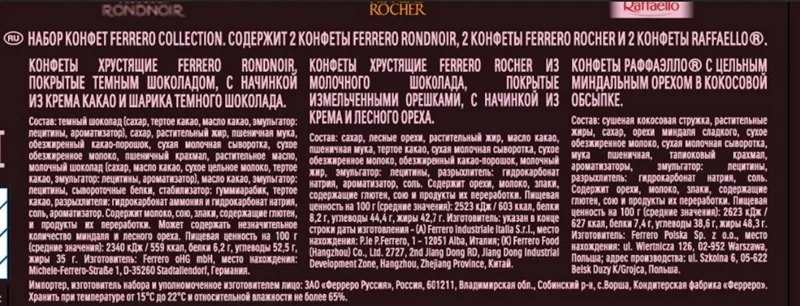 Изысканное ассорти из лучших продуктов компании включает в себя три вида конфет: Rocher, Raffaello и Rondnoir. Каждое из них обладает уникальными вкусовыми характеристиками и составом.