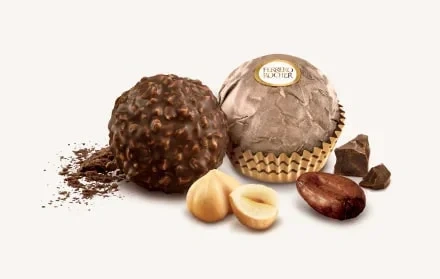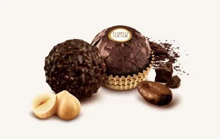 Набор шоколадных конфет: Ferrero Rocher (хрустящие вафельные конфеты с начинкой из шоколадного и орехового крема, посыпанные тертыми орешками), Ferrero Garden (хрустящие вафельные конфеты с нежной ореховой начинкой и цельными фисташками внутри), Ferrero Rondnoir (хрустящие вафельные конфеты c начинкой из крема и какао, покрытые горьким шоколадом). Отличаются приятным вкусом с шоколадными и сливочными нотками, обладают воздушной текстурой.