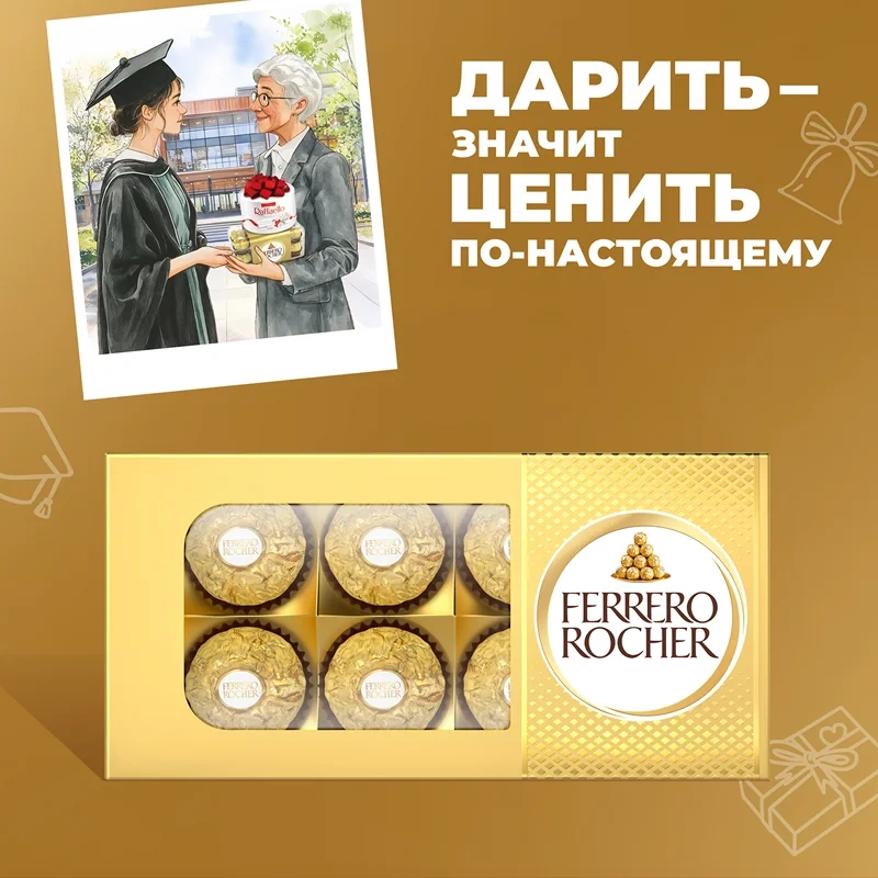 Что мы ценим больше всего в жизни? Время, проведенное со своей семьей, любовь, настоящая дружба - чувства, которые мы испытываем, когда близкие люди рядом. Такие моменты заслуживают особого празднования, потому что минуты радости становятся еще более запоминающимися вместе с Ferrero Rocher. Сочетание цельного фундука и восхитительного сливочно-орехового крема в хрустящей вафельной оболочке подарит неповторимые вкусовые ощущения. Уникальная золотистая упаковка делает конфеты Ferrero Rocher еще более изысканными. Разделите удовольствие, наслаждаясь их вкусом в компании близких людей. Ferrero Rocher помогает нам быть ближе с теми, кого мы любим и ценим.