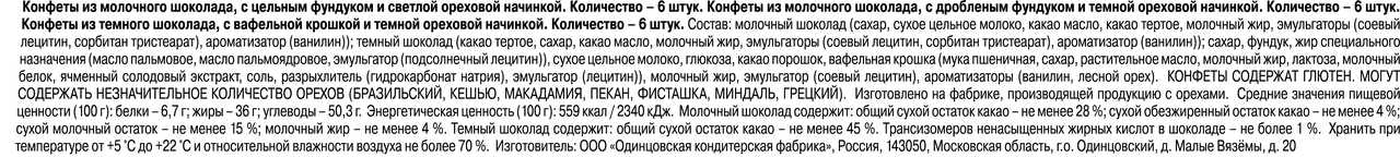 Удивительная и гармоничная композиция, составленная из разнообразных сочетаний настоящего молочного шоколада, светлой ореховой и темной ореховой начинки со вкусом кленового сиропа, с добавлением вафель, а также карамелизированного грецкого ореха с нотками карамели.