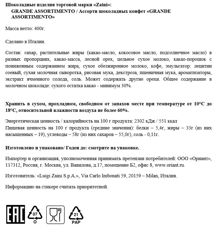Итальянская компания Zaini производит шоколадные изделия более 100 лет. Компания уделяет самое пристальное внимание отбору и исследованию сырья, а так же безопасности всего производственного цикла для создания шоколада и конфет с их неповторимым вкусом. Качество продукции гарантировано самыми строгими международными сертификатами. Это ассорти самых популярных конфет премиум класса от Zaini. Внутри Вы найдете оригинальные конфеты из молочного шоколада с начинкой пралине из орехового крема с цельным фундуком, и шоколадные конфеты с нежным ореховым пралине, а также шоколадные конфеты с другими восхитительными начинками. Продукт не содержит пальмовое масло. Набор шоколадных конфет, который станет прекрасным подарком для близкого человека или желанным лакомством за домашним столом. В стильной коробке каждый найдет десерт по своему вкусу - конфеты с фундуком и кремовой начинкой, покрытые молочным или темным шоколадом.