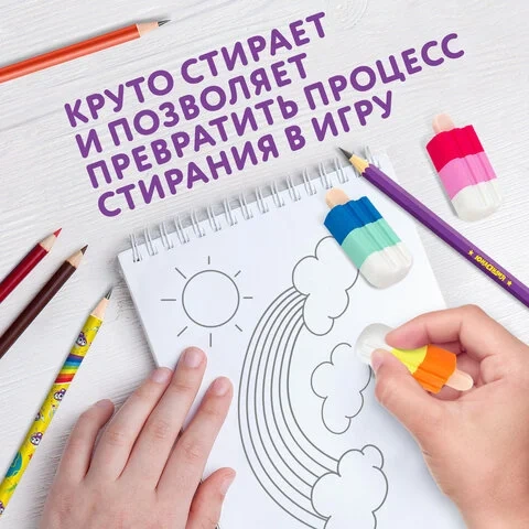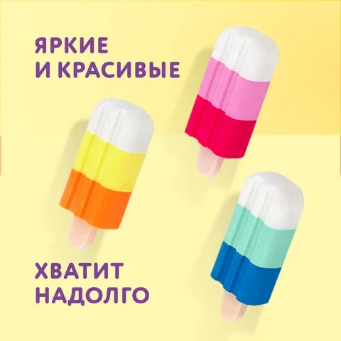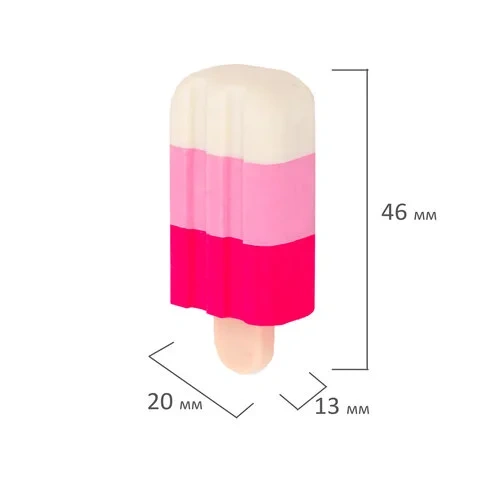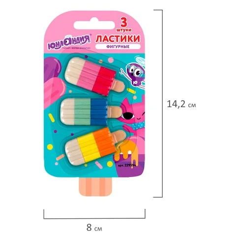 Набор состоит из ластиков трех цветов ассорти. Имеют форму мороженного. Ластики обеспечат лёгкое и чистое стирание без повреждения поверхности бумаги и без образования бумажной пыли. Размер - 46х20х13 мм. Поставляются в блистере с европодвесом.