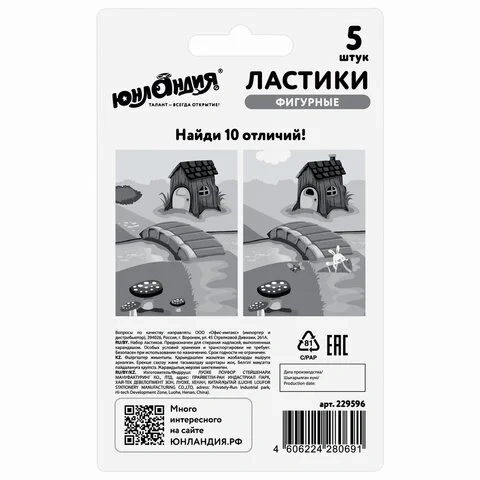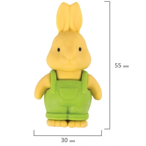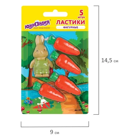 Набор состоит из пяти ластиков в форме зайчика и моркови. Ластики обеспечат лёгкое и чистое стирание без повреждения поверхности бумаги и без образования бумажной пыли. Поставляются в блистере с европодвесом.