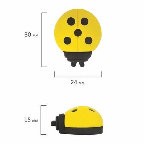 В наборе три ластика в форме божьей коровки. Цвет - ассорти. Размер каждого ластика - 30х24х15 мм. Поставляется в дисплее в индивидуальной упаковке.