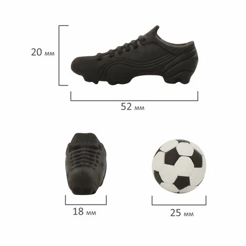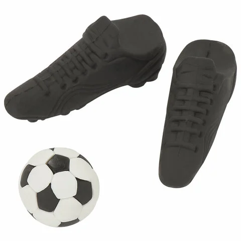 Набор состоит из трех ластиков одной тематики: две бутсы черного цвета с отверстием для карандаша и футбольный мяч. Используется не только в работе и учебе, но и для игры.