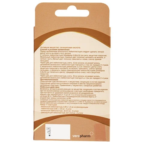 Основными действующими веществами пластыря являются салициловая кислота, которая размягчает ткани натоптышей, а также сера обеспечивающая противомикробное и кератолитическое действия на кожные покровы, причем салициловая кислоты улучшает проникновение серы в глубоколежащие слои кожи, что способствует угнетению бактериальной либо грибковой инфекции, сопровождающей в некоторых случаях образование натоптышей.