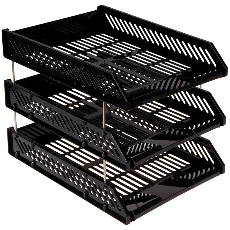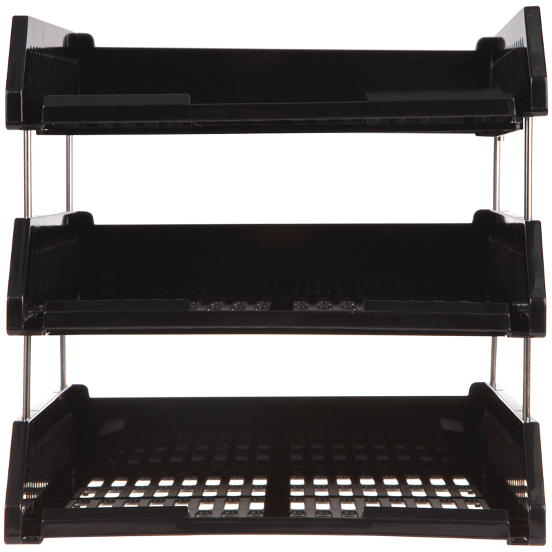 Лоток для хранения бумаг, сборный, 3 отделения, цвет черный. Секции крепятся между собой с помощью металлических стержней, которые идут в комплекте с лотком. Верхняя секция может разворачиваться на 90 градусов. Упаковка в термопленку.