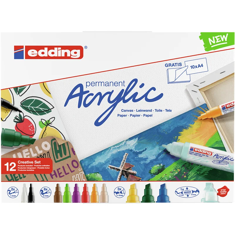 Акриловый маркер для рисования на светлых или темных поверхностях, идеален для нанесения на такие материалы, как холст или бумага для рисования. В наборе содержатся 2 тонких акриловых маркера edding 5300, 6 средних акриловых маркеров edding 5100, 3 широких акриловых маркера edding 5000 и 1 акриловый двусторонний 3D маркер-аппликатор edding 5400. edding 5300 акриловый маркер тонкий: по 1 шт. черного и транспортно-белого цветов. edding 5100 акриловый маркер средний: по 1 шт. таких цветов, как желто-зеленый, солнечно-желтый, транспортно-красный, ягодный, насыщенный бежевый и лесной орех. edding 5000 акриловый маркер широкий: по 1 шт. таких цветов, как зеленый мох, горечавково-синий и транспортно-желтый. edding 5400 акриловый двусторонний 3D маркер-аппликатор: 1 шт. пастельно-синего цвета. Высококачественная пигментированная акриловая непрозрачная краска на водной основе, практически без запаха, отличается светостойкостью и перманентностью после высыхания. Такие цвета, как черный, транспортно-красный, горечавково-синий, ягодный, лесной орех, желто-зеленый и зеленый мох, характеризуются высокой укрывистостью. Остальные оттенки являются полупрозрачными. Доступны подходящие запасные наконечники (запасные наконечники edding 5100, 5300 и 5000). Цвета в наборе: чёрный матовый, транспортно-красный матовый, транспортно-жёлтый матовый, cолнечно-жёлтый матовый, ягодный матовый, зелёный мох матовый, горечавково-синий матовый, лесной орех матовый, пастельно-синий матовый, жёлто-зелёный матовый, транспортно-белый матовый, телесного цвета. Наборы акриловых продуктов для начинающих доступны в двух различных форматах Набор акриловых продуктов для начинающих «small nordic»: 2 тонких акриловых маркера edding 5300 и 6 средних акриловых маркеров edding 5100 Большой набор акриловых продуктов для начинающих «large realistic»: 2 тонких акриловых маркера edding 5300, 6 средних акриловых маркеров edding 5100, 3 широких акриловых маркера edding 5000 и 1 двусторонний 3D маркер-аппликатор edding 5400 Новый акриловый двусторонний 3D маркер-аппликатор edding снабжен двумя насадками разных размеров, позволяющими применять уникальные техники рисования Примечание: акриловый двусторонний 3D маркер-аппликатор edding доступен только в большом наборе акриловых продуктов для начинающих