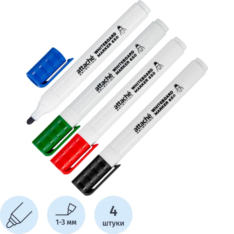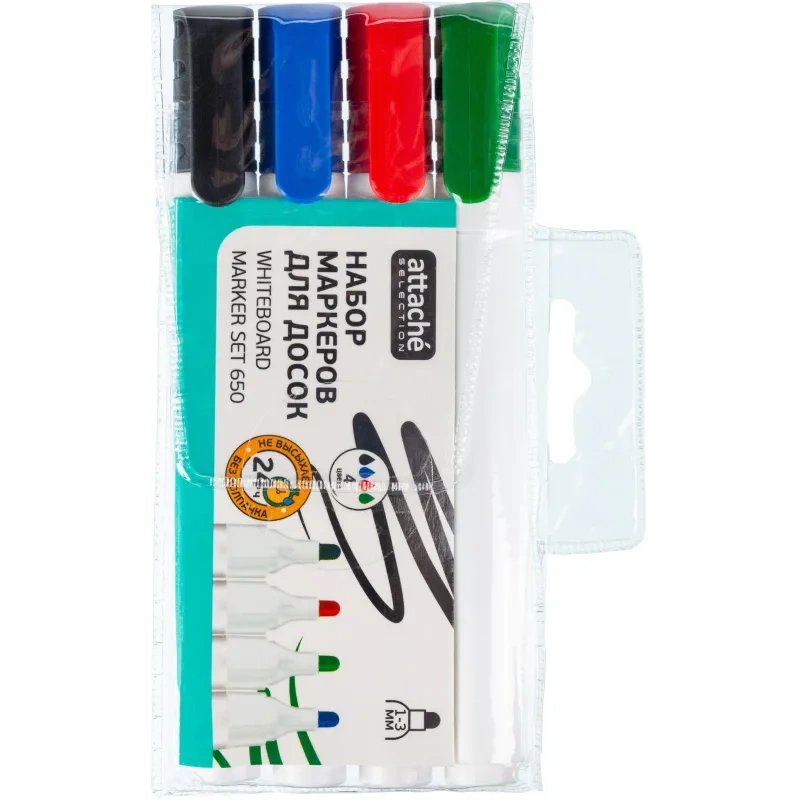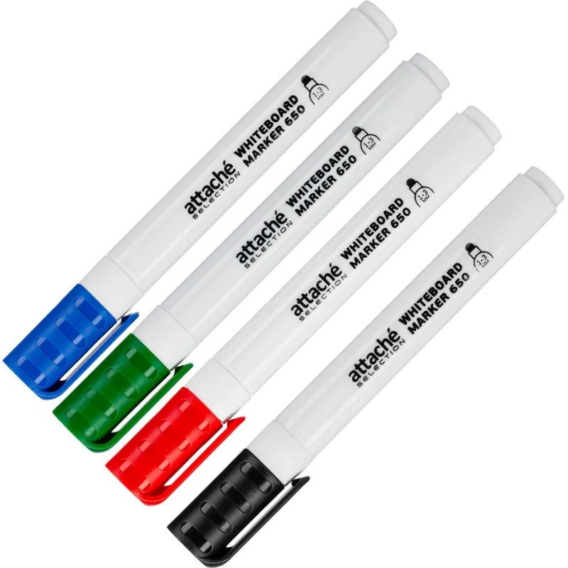 Набор маркеров для досок Attache Selection 650 в прочном пластиковом корпусе. Чернила на спиртовой основе, не содержат ксилол и толуол. Идеально подходит для надписей на белых досках с магнитно-маркерной поверхностью. Надписи можно легко стереть сухой губкой. Прочный акриловый наконечник круглой формы позволяет провести линию толщиной от 1 до 3 мм. В наборе 4 цвета. Изделие не перезаправляется. Внимание! Маркеры для досок необходимо хранить в горизонтальном положении или фетром вниз.